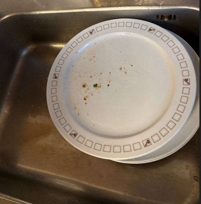 Vores opvaskemaskine vasker desværre ikke særlig godt af. Det er ofte sådan, at når man tømmer maskinen, kan man få rester fra dagen før, så vær venlig at skylle af inden I sætter i opvaskemaskinen. Hæld gerne pulveret direkte ind i maskinen og ikke i sæbebeholderen, for der sidder det ofte fast. Nedenstående stabel tallerkner blev taget ud af maskinen fredag morgen i sidste uge.